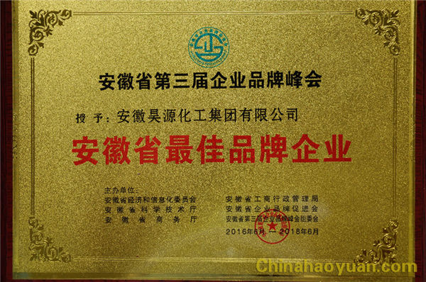 2016年6月18日,由安徽省經(jīng)濟(jì)和信息化委員會(huì)、安徽省科學(xué)技術(shù)廳、安徽省商務(wù)廳、安徽省工商行政管理局和安徽省企業(yè)品牌促進(jìn)會(huì)共同舉辦的安徽省第三屆企業(yè)品牌峰會(huì)在安徽省人大會(huì)議中心隆重舉行,省有關(guān)領(lǐng)導(dǎo)及企業(yè)代表100余人出席會(huì)議。安徽昊源化工集團(tuán)有限公司在本屆企業(yè)品牌峰會(huì)上榮獲“安徽省最佳品牌企業(yè)”稱(chēng)號(hào),并被授予安徽省企業(yè)品牌促進(jìn)會(huì)理事單位。